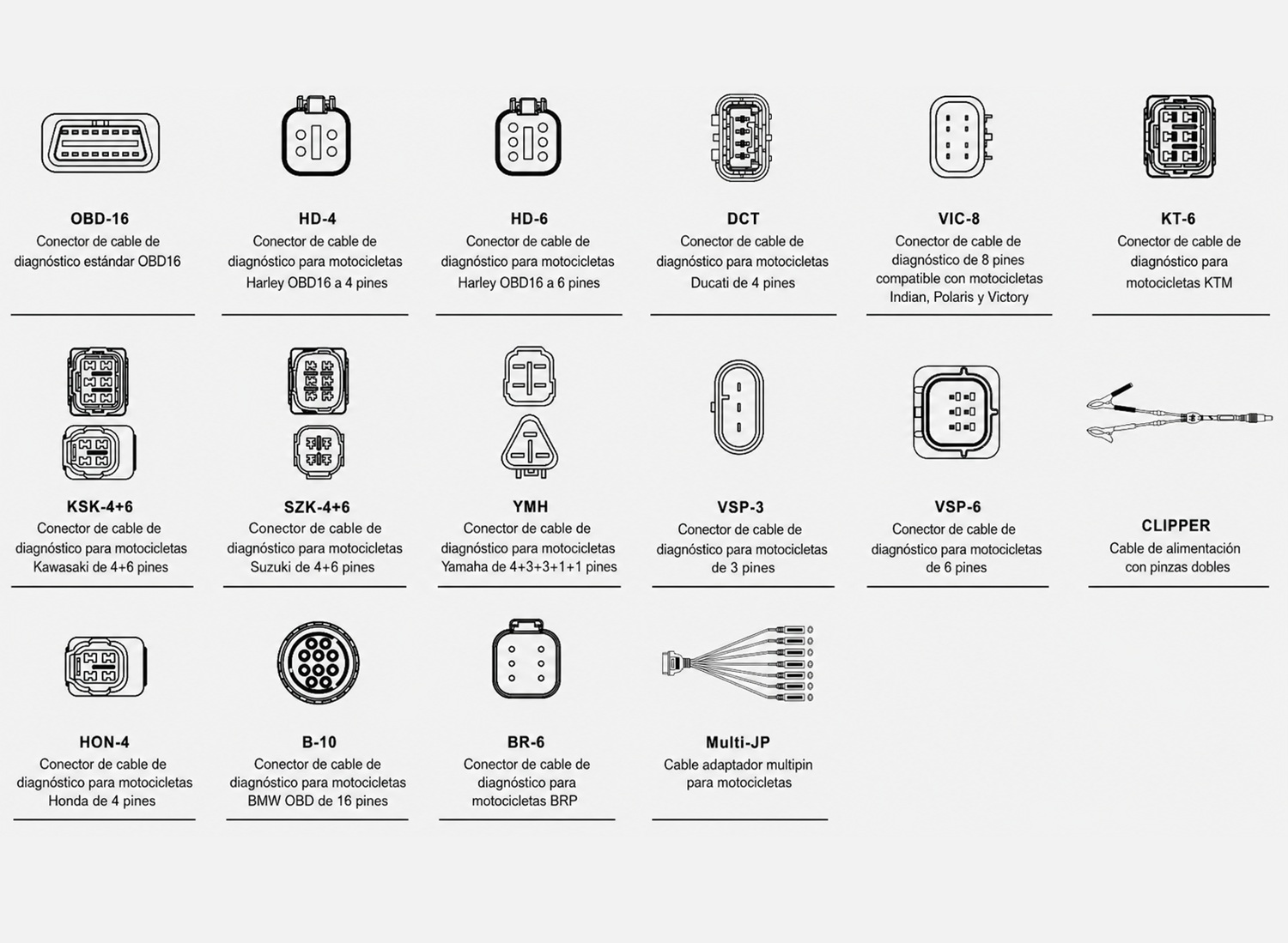 - Amplia compatibilidad multimarca: incluye adaptadores y cables jumper universales para trabajar con diferentes modelos de motocicletas.